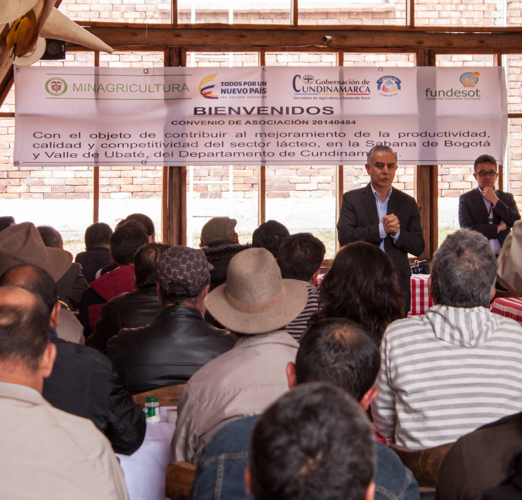 Desarrollamos el Convenio de Asociación No. 484-2014, cuyo objetivo es aunar esfuerzos técnicos, administrativos y financieros entre el Ministerio de Agricultura y Desarrollo Rural-MADR, el Departamento de Cundinamarca y la Secretaría de Agricultura y Desarrollo Rural-SADR, y la Fundación para el Desarrollo Sostenible Territorial-FUNDESOT, para contribuir al mejoramiento de la productividad, calidad y competitividad del sector lácteo en la Sabana de Bogotá y Valle de Ubaté, del Departamento de Cundinamarca. El convenio se realiza con 600 pequeños y medianos productores de leche asociados a Organizaciones Ganaderas-OG, en 20 municipios de la cuenca lechera de la sabana de Bogotá y valle de Ubaté. Las actividades realizadas dentro del convenio se dividen en cuatro componentes: